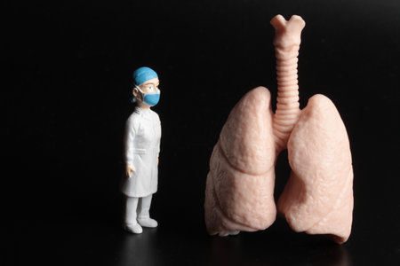 miniature doctor and human lungs on a black background, concept of health care