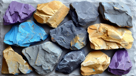 A collection of colorful rocks with a variety of textures and patterns. The rocks are arranged in a way that creates a visually interesting and dynamic composition. Scene is one of natural beauty