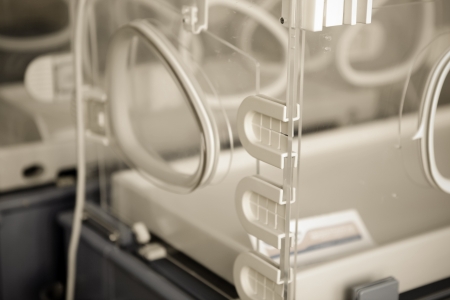 Newborn child baby having a treatment for jaundice under ultraviolet light in incubator.