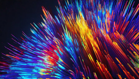 Vibrant colorful light streaks burst outwards from a central glowing point against a dark background.