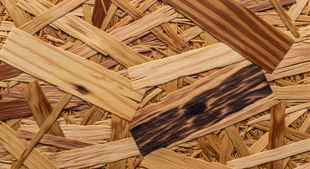 Intricate patterns of wooden planks showcase various shades and textures, emphasizing artistry in a contemporary interior decor style.