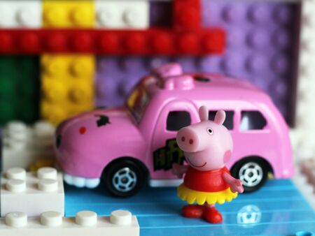 Tambov, Russian Federation - August 29, 2014 Lego custom made car on Lego road baseplate. Purple background. Studio shot.
