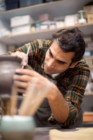 Young man making and decorating pottery in workshop