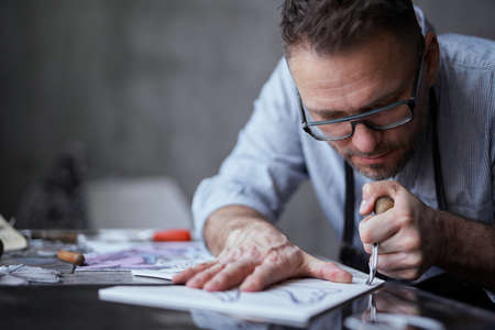 Lithograph professional artist handmade worker. Bearded middle aged man in apron and glasses making linocut using cutting instrument. High quality photo