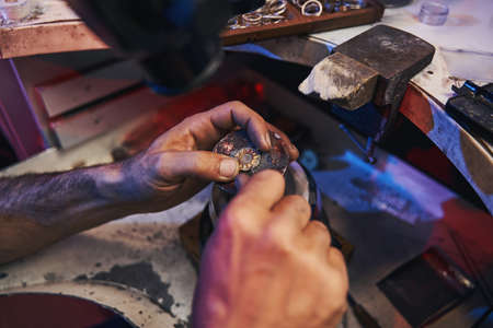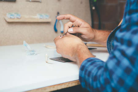 master jeweler works at his workplace in a jewelry workshop. Jewelry making, handmade.