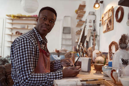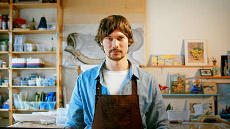 Calm young ceramist posing for camera at work