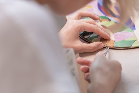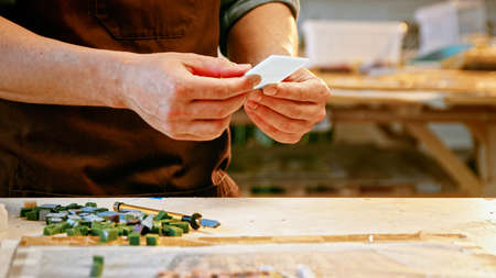 Workplace of the mosaic master: womens hands holding tool for mosaic details in the process of making a mosaic