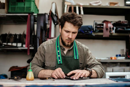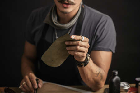 Close-up of craftsman holding pieces of leather textile in his hands and making products in workshop