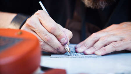 A close-up of a tattoo artist's hands, carefully working on a detailed design in a tattoo parlor