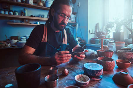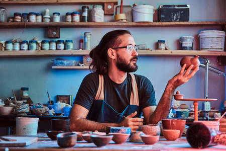 Pensive entusiastici potter in glasses at his own workshop is workig on a new handmade teapot.