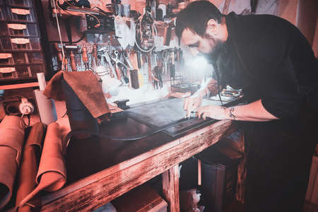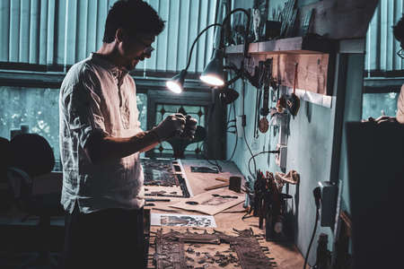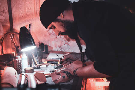 At the cozy studio a leather designer is working on his new project.
