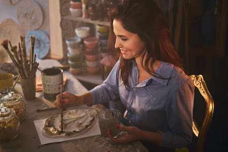 Cheerful beautiful woman is making a beautiful decorative plate at her workshop.
