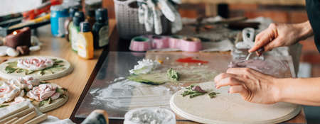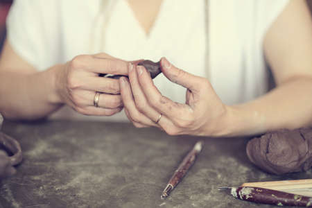Artist at work. Craft artwork in process. Professional handicraft. Young woman working with polymer clay.