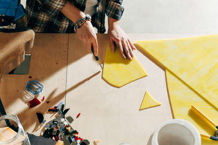 Mid section portrait of unrecognizable craftsman laying out tiles while creating mosaic in workshop studio, copy space