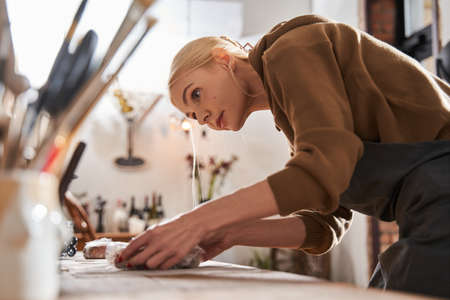Woman preparing her workplace while putting piece of clay at the table with concentrated face