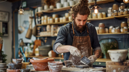A bearded male artisan focused on crafting pottery, surrounded by shelves of clay pieces in a warm rustic workshop setting.