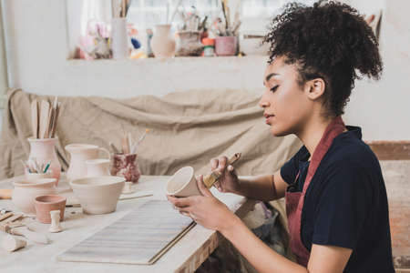 serious young african american woman glazing clay pot with brush near table with equipment in pottery