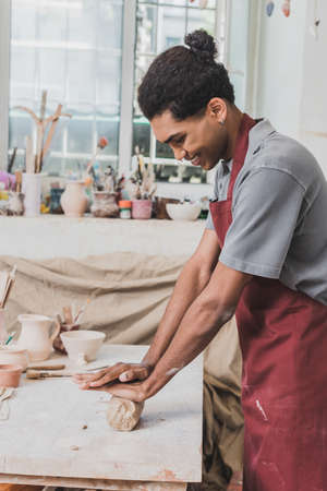smiling young african american man in apron working with clay in pottery