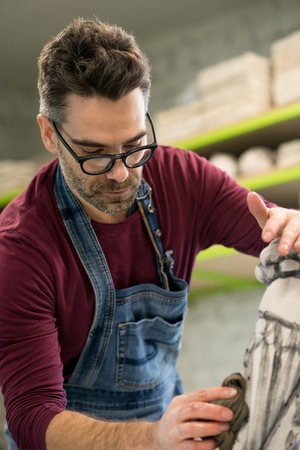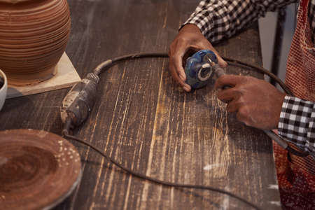 Closeup photoshoot of working process with clay by diligent man.