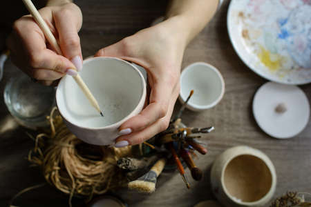 Professional woman potter, decorator painting ceramic souvenir refrigerator magnet in pottery workshop, studio. Crafting, artwork and handmade concept