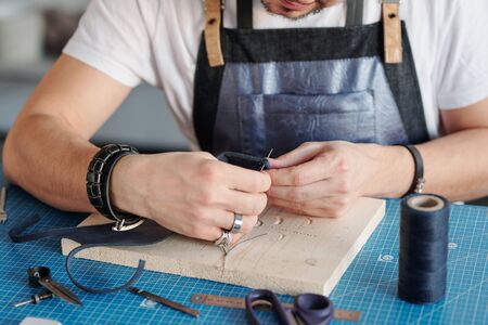 Close up of anonymous modern artisan punching holes in handmade leather belt at workshop, copy space