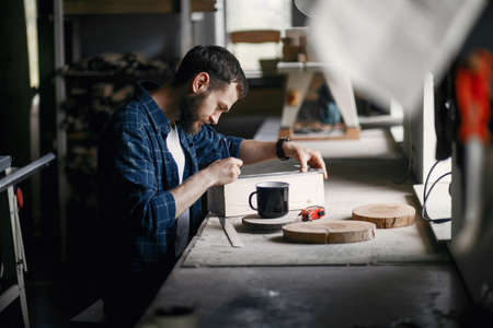 Man in the workshop with a wood
