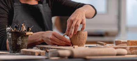 Artist at work. Studio workplace. Ceramic artwork in process. Handicraft. Woman with modeling tools in hand.