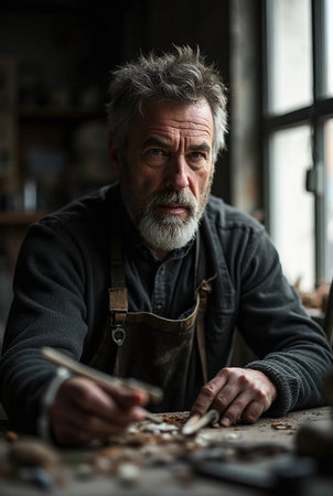 Portrait of an old craftsman working in his workshop, looking at the camera.