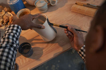 Ceramic artist painting exterior surface of pottery piece