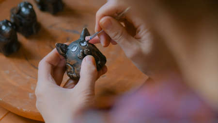 Professional woman potter, decorator painting ceramic souvenir penny whistle toy cat in pottery workshop, studio. Crafting, artwork and handmade concept