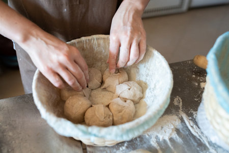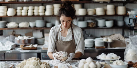 The photograph portrays a pastry chef deeply focused on the delicate art of confectionery, hands dusted with flour as she prepares a batch of sweets. In the backdrop of her workspace, one can observe a serene arrangement of kitchenware and various stages of pastry creation, highlighting the meticulous process behind each dessert. Her dedication reflects the precision and passion that baking demands, making this image ideal for culinary publications, food blogs, and educational content spotlighting the skill and attention to detail involved in professional pastry arts.