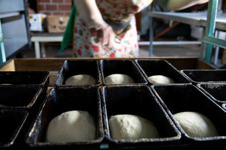 The process of making brioche in an artisan bakery. Laying the dough in the baking molds. Front view.
