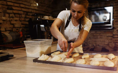 a girl cook in a cafe sprinkles coconut shavings on raw pies lying on a tray.