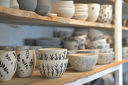 A charming array of handmade clay pottery arranged on rustic wooden shelves, showcasing the beauty of craftsmanship and the warm tones of earthen materials in a cozy workshop setting.