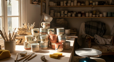 A sunlit workbench in a pottery studio filled with stacked ceramic mugs, carving tools, and sponges. A pottery wheel sits in the foreground, creating an artistic and creative workshop atmosphere.
