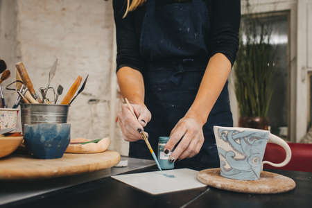Professional potter using paintbrush for painting unglazed earthenware