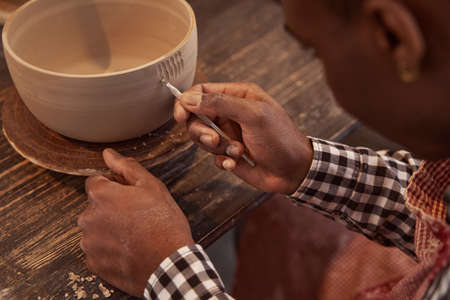 Potter working with clay pottery in artisan workshop