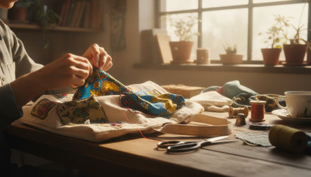 A person is meticulously hand-stitching a vibrant quilt or fabric project on a wooden table, surrounded by sewing supplies and plants