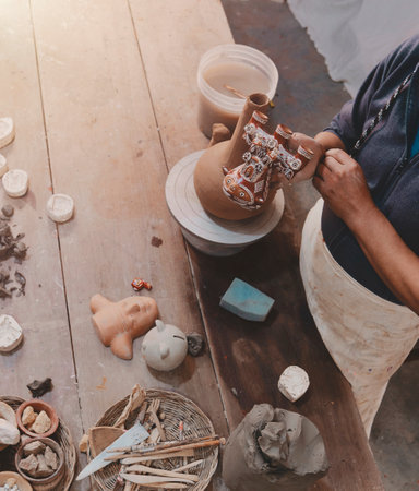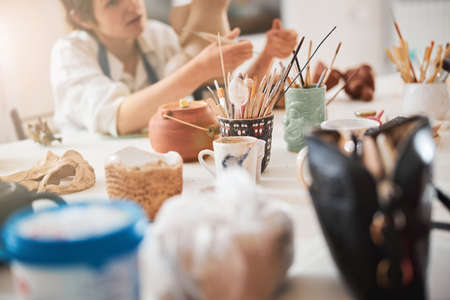 A potter in a plaid shirt and apron paints a clay plate in white in workshop, top view, close-up, selective focus. There are some tools, clay samples and paint jars in the background. Aristic manufacturing. Creative hobby. Art and crafts concept.