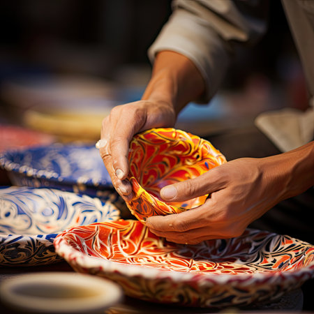 Artisan is carefully painting a floral pattern on a ceramic plate, surrounded by other plates in various stages of completion