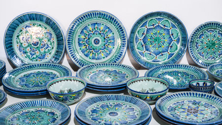 Uzbek handmade ceramic plates with hand-painted ethnic Oriental colorful patterns in tableware store