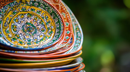 hand-painted decorative ceramic dinner plates lined up, created with generative ai