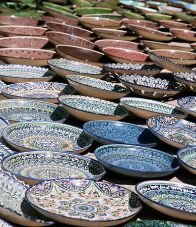 Traditional ceramic dishware in a street market, Uzbekistan