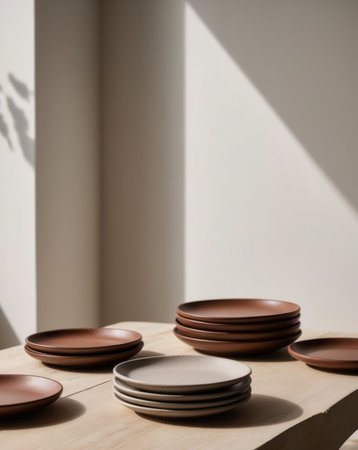 AI Generated. Collection of handmade ceramic plates in earth tones for home decor and dining