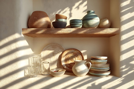 Rustic kitchen shelf adorned with an assortment of ceramic bowls and plates. the arrangement includes earthenware pieces of varying shapes and textures, complemented by glassware, bathed in soft natural sunlight and shadow patterns. Generative AI