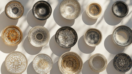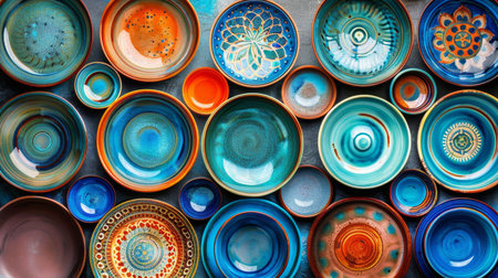 An artistic display of colorful ceramic plates and bowls showcasing intricate designs and textures, perfect for enhancing any dining space or collection.