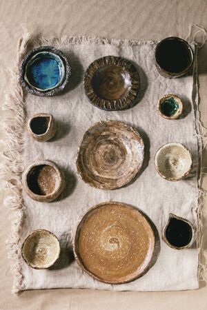 Top view of porcelain dishes handmade. Ceramic glazed plates are empty on a gray background with copy space. Flat lay