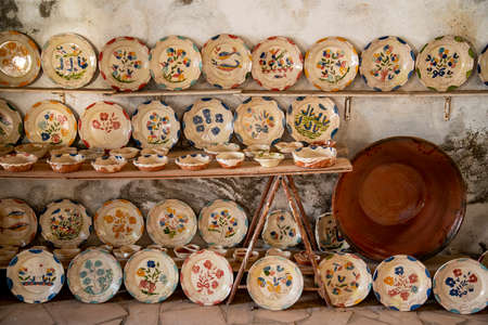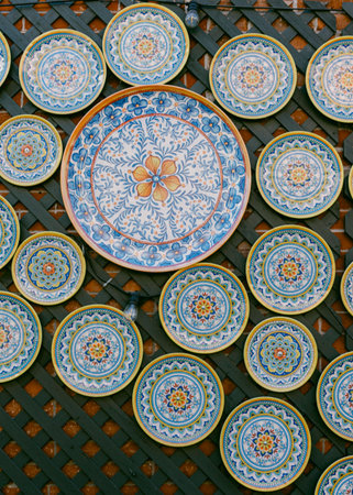 Collection of colorful Portuguese ceramic pottery, local craft products from Portugal. Ceramic plates display in Portugal. Colorful of vintage ceramic plates in Sagres, Portugal.