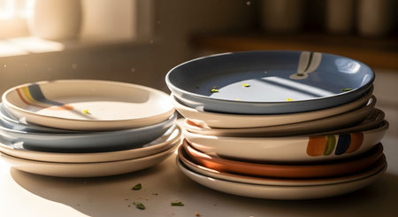 Several stacks of dirty ceramic plates sit on a kitchen counter, illuminated by natural sunlight. The image represents the aftermath of a meal and the daily routine of household chores.
