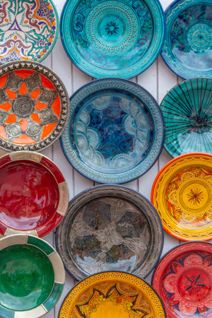 Colorful faience pottery dishes and tajines on display in Moroccan market